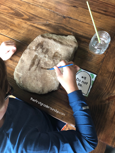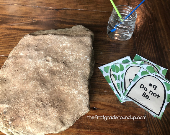 You can prep the stones by writing one commandment on each stone with a white crayon or sharpie. Then, let the kids use the water to "paint trace" over the commandments.