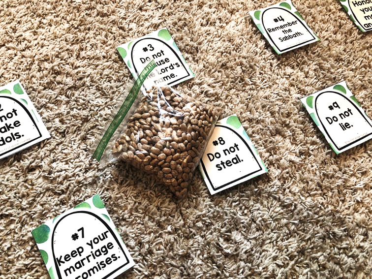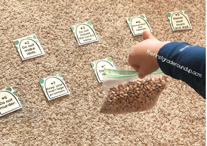 The kids take turns tossing a bean bag. Whichever card they land on, they have to share one way to follow that commandment.