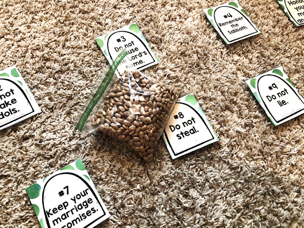 I use this as a review game! I print each commandment card that we have learned so far out and lay them out on the floor. If we've only learned 3 commandments, only 3 cards get put out. If we've learned all 10, all 10 cards go down on the floor.