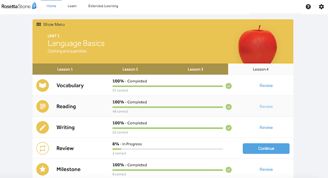 I've been monitoring my son's progress and appreciate that Rosetta Stone makes it easy for my to track his progress. Since I am often working while he is busy with schoolwork, it's nice to be able to see progress reports like the one below.