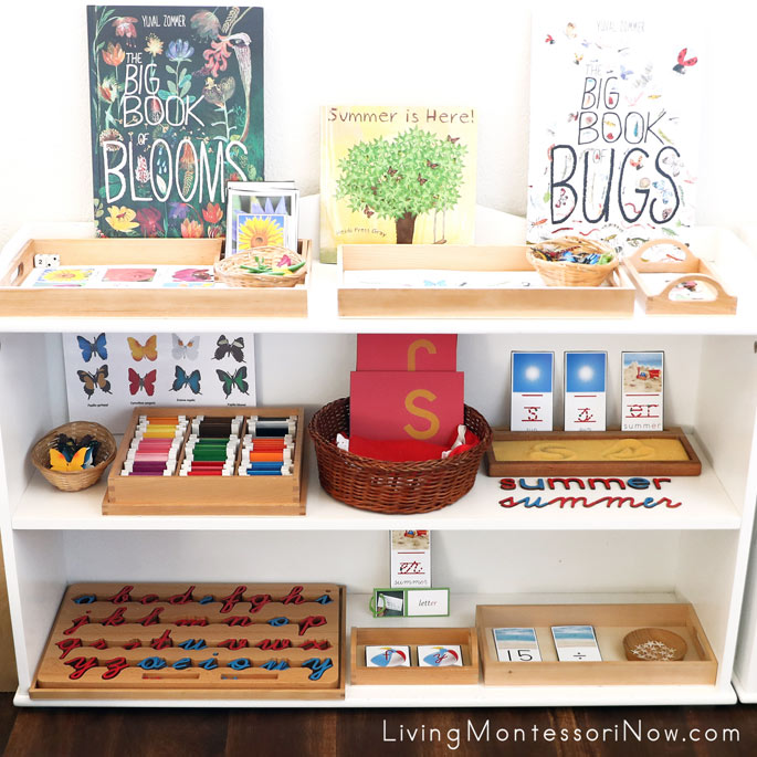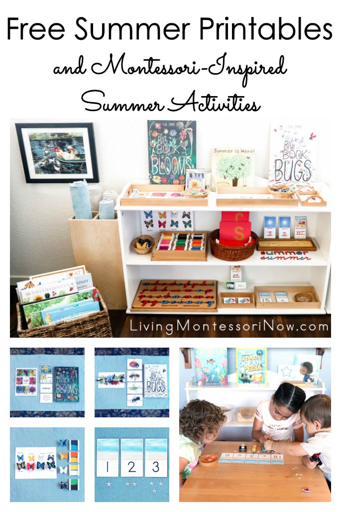 You’ll find Montessori-inspired summer numbers, letters, and and more (part of my subscriber freebie pack, so just sign up for my email to get the link and password … or check the bottom of your latest newsletter if you’re already a subscriber) Go to my Free Summer Printables and Montessori-Inspired Summer Activities post at Living Montessori Now for the free printables and activity ideas you see on the shelf and collage above!