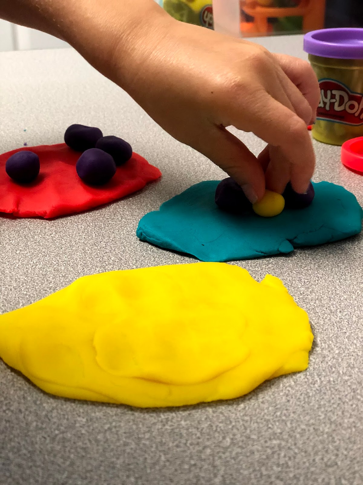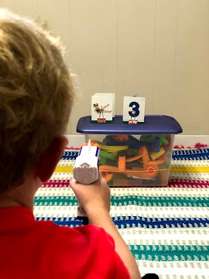 Counting! Number identification, naming, and one to one correspondence are all important skills. For example, a child should know what the number 3 looks like, be able to say the number when he/she sees it, and count 3 objects. I use any opportunity I can to count objects. Last week we made pizzas out of play doh and counted how many toppings were on each one. We also tied in receptive and expressive language, role playing, symbolic play, requesting, and asking questions. Probably the most requested activity that I get to address counting with is with Easter eggs. Who cares if it's July, your students will almost aways be down for an egg hunt. Any small items work, but I love using the colored counting bears to stuff the eggs. You can also target naming colors and sorting with them, too! Here are some options to purchase on amazon. I put a certain number of counting bears in the eggs, hid them, then let my student find the eggs. This was a great opportunity to work on spatial skills (I found the egg UNDER the chair!) When all the eggs are found, we open them up one by one and count them. I use a sheet that has the numbers we are working with and the matching number of dots under the written one for a little extra help.
