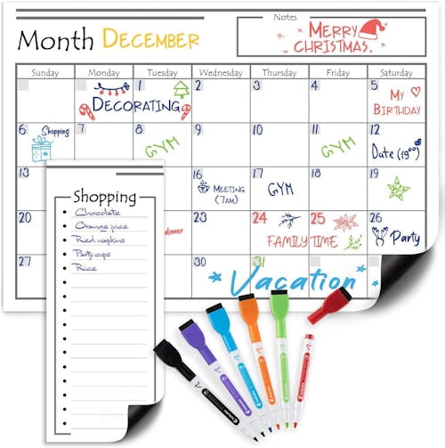 Missed meetings, forgotten soccer games, and the unmanageable mess of managing several schedules are forever sorted when you stick this dry-erase calendar to the fridge and make everyone responsible for putting their events on it. It comes with six colored erasable markers so you can color code to your heart’s content. There is even a bonus shopping list you can stick to the fridge, too, so everyone can note what they want from the store.