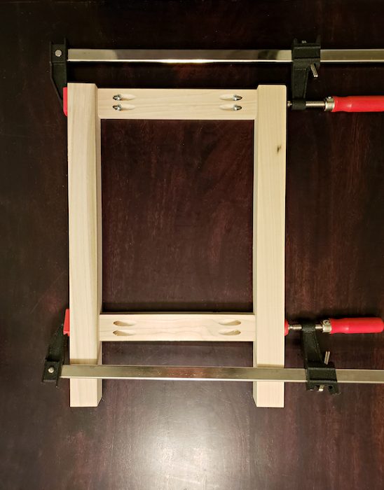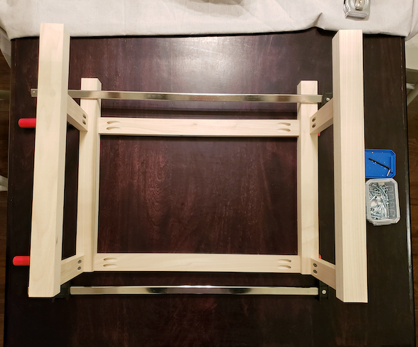 We screwed the 1" x 2" side pieces into the 2" x 2" legs (twice). Then we attached the back and front 1" x 2" pieces.