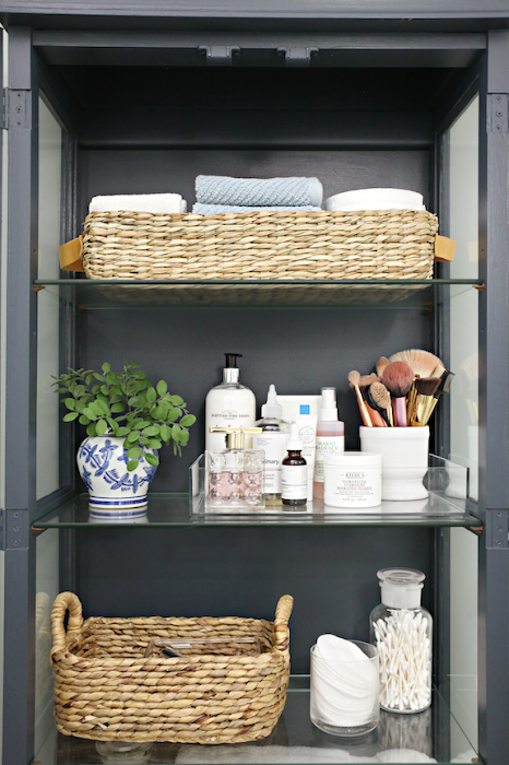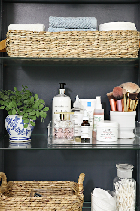 Because we added a small shelf below, I was able to fit two tall baskets to conceal the less sightly toiletry clutter such as small grooming tools and a manicure kit.