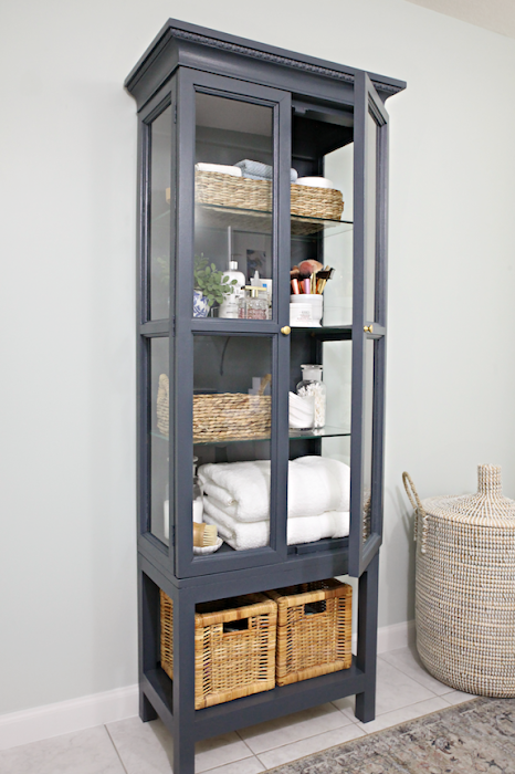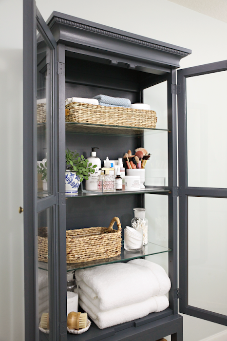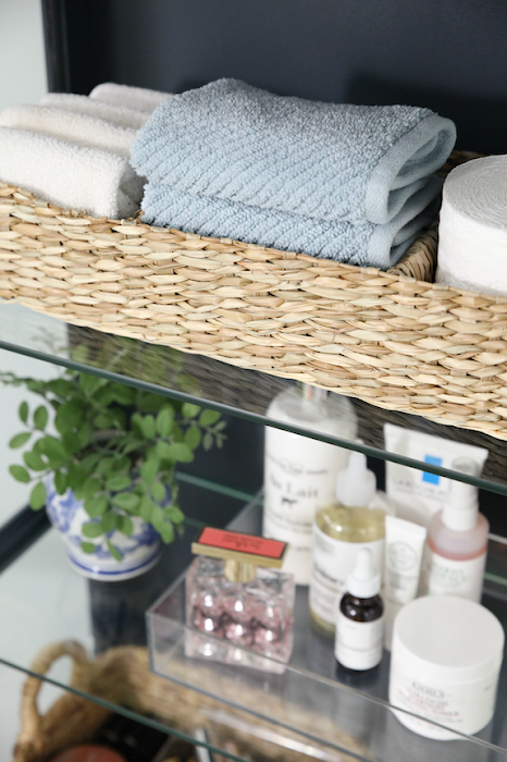 I use the cabinet to hold everything I reach for on a daily basis. The top shelf holds a divided basket with face cloths, washcloths, and an extra roll of toilet paper.