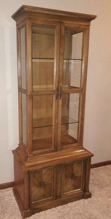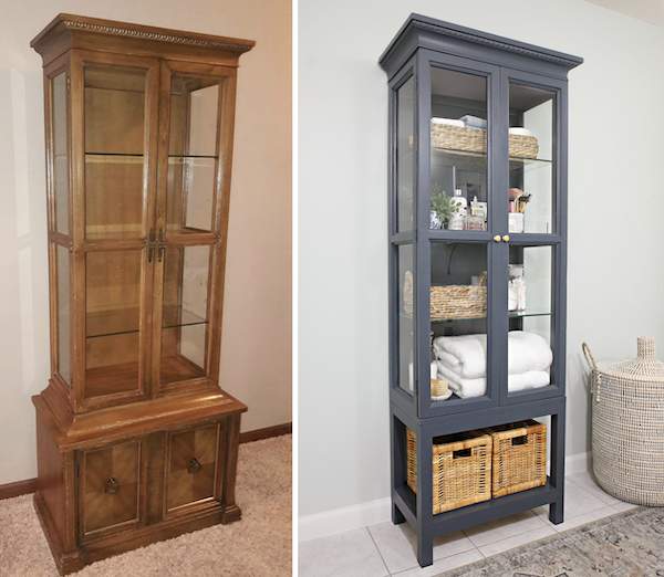 With that in mind, I went straight to Facebook Marketplace to look for an inexpensive solution. I was looking for a piece of furniture that wasn't too deep (I didn't want it to be obtrusive in our modest-sized bathroom) and something with doors. With the germs that fly in the bathroom, I always prefer storage behind drawers and doors. Doors also cut down on the amount of surface that I have to clean and wipe down frequently. I initially thought a lawyer style bookcase would be a bit different, but with our bathroom being on the smaller side, I ultimately decided it would be nice to do something with more glass. So I started to search for curio style cabinets that were less than 14" deep.