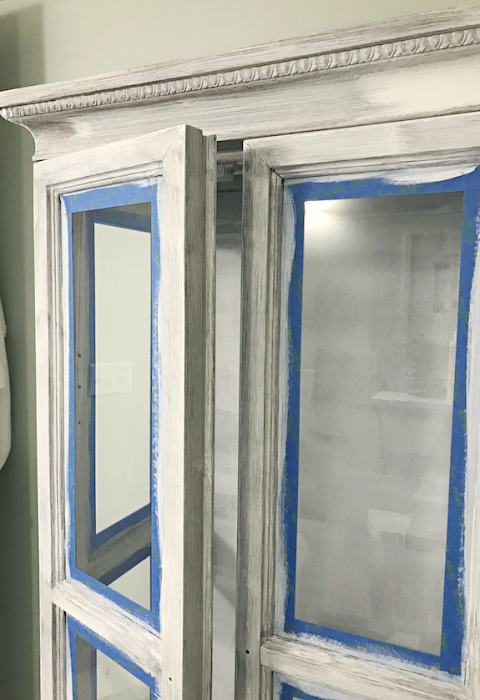 Prior to painting, I did a few things to prep the cabinet. We used our brad nailer to affix the shelf to the base. Then I caulked all of the cracks around the legs. I used a sanding block to sand everything down. After that, I took a liquid deglosser to the top half of the cabinet because the wood had a chipping top coat and I wanted to be sure I wasn't going to have any trouble with paint adhering. Not done yet, I used some wood filler to fix any cracks, dents, holes, scratches, etc... Finally, I taped all of the glass off with painter's tape and found my oil-based primer.