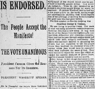 The "1890 Manifesto", sometimes simply called "The Manifesto", was a statement which officially ceased the practice of plural marriage in The Church of Jesus Christ of Latter-day Saints (LDS Church).