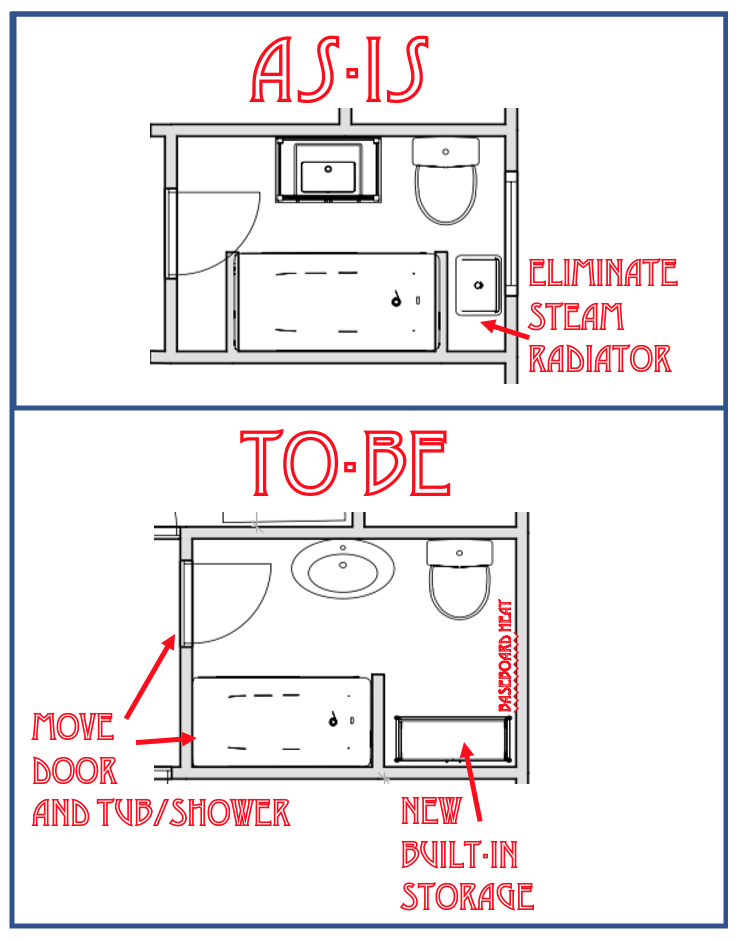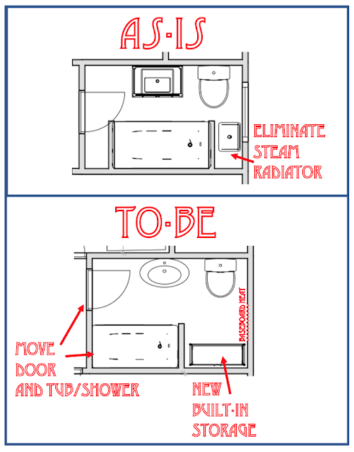 How to do that? I went back and looked at a bathroom we did in another bungalow in 2014. It took its cues from an American Standard advertisement for a 'Sanitary Bathroom', which was a huge trend in the 1920's, about the time this house was built (click here to see the story about Sanitary Bathrooms). Gleaming white, easy to clean fixtures were the name of the game. I'd like to do something similar for this bathroom (but not a clawfoot tub, most buyers prefer a tub/shower combination).