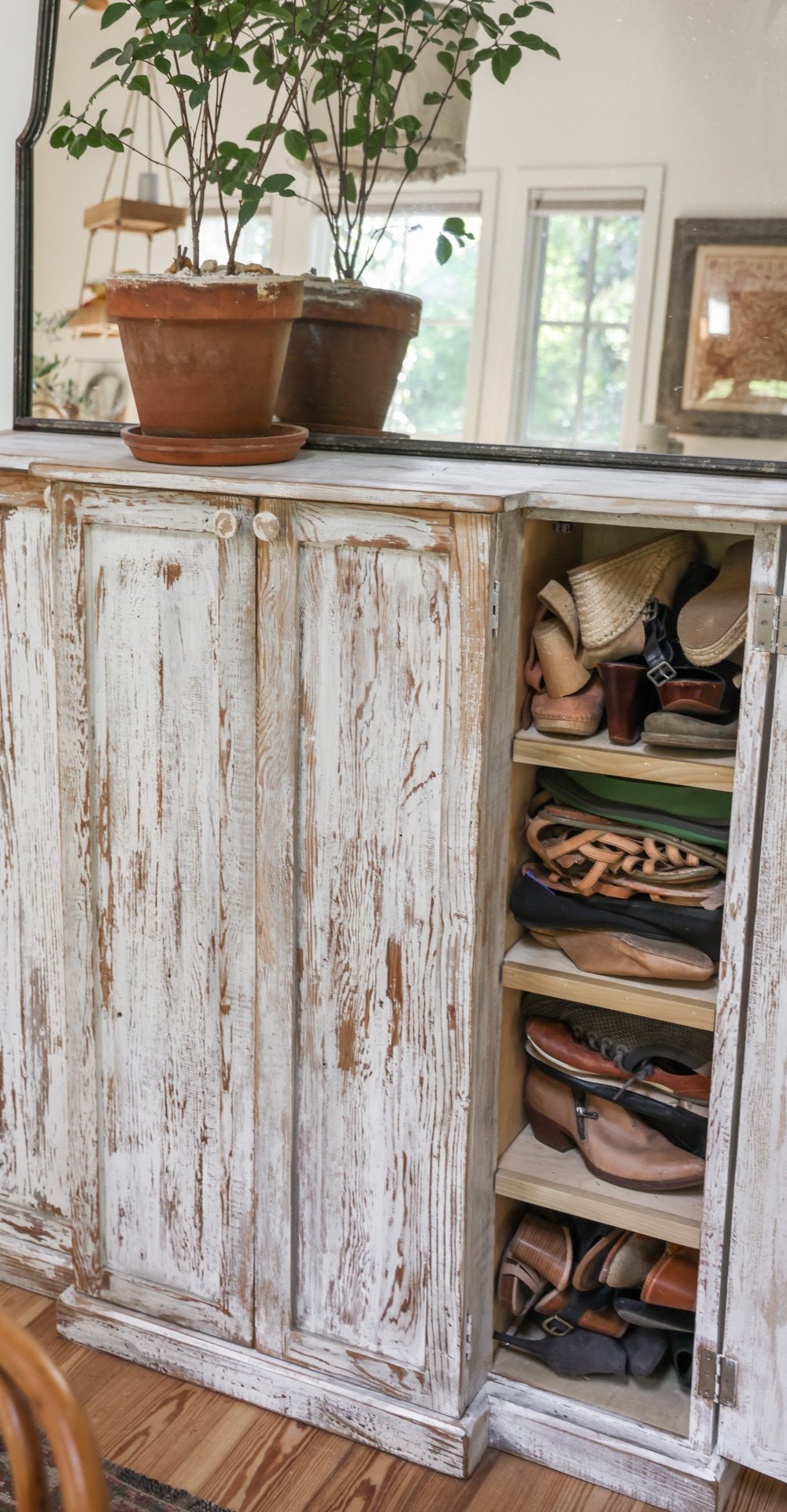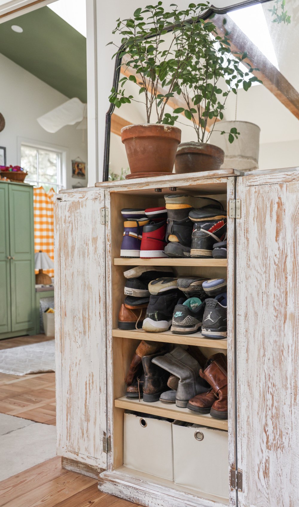 This three-part, four-doored cabinet holds almost all of the shoes for our family of four. (There are some frequently used pairs — as well as a few tall boots — stashed elsewhere for doorside access and utility.)