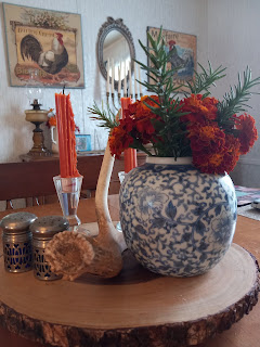 I have Pele mums that I bought two weeks ago on the mantle. I trimmed the flowers one more time this morning and put them in a pewter stein instead of in a taller vase. This morning I went out to gather a little bouquet of flowers for the dining room table. The flowers on the dining table replaced the artificial picks I'd used.