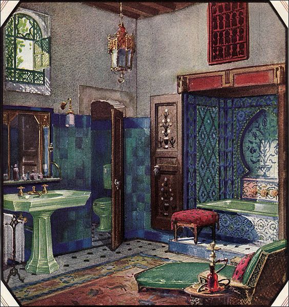 The green of this bath suite's porcelains was a brand new trend, just being introduced. The design of the bathroom is over the top with an almost Middle Eastern/ Eastern Mediterranean feel. The lantern as the central light, the grillwork on the window and what appears to be a vent above the tub, the onion shape of the arch in the shower, even the hookah says that this bath belonged to someone who had likely traveled the Middle East. The colors are cool and lovely but the addition of that Turkish carpet and the pelmet above the shower alcove add warmth.