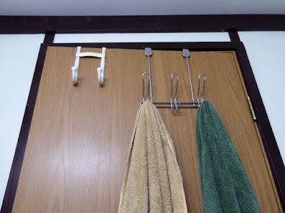 The previous owners left some door hooks inside the bathroom door. The left-hand hooks are too tall for me to reach. I can reach the lower hooks on the right-hand side, but not the upper hooks.