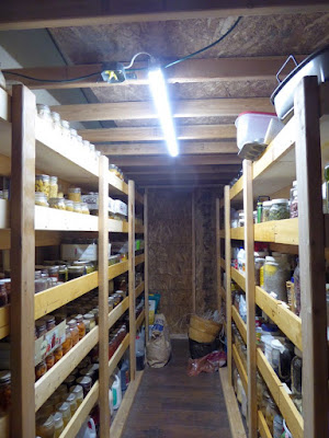 As for the wonderful pantry Don built – well, it's perfect. He built it just the right size for halflings. I didn't realize this until some neighbors (husband and wife) came over to visit and we showed them this customized storage space. The husband's head literally brushed the light, and he was by no means excessively tall. But hey, it works for us (though I need the step ladder to reach the highest shelves).