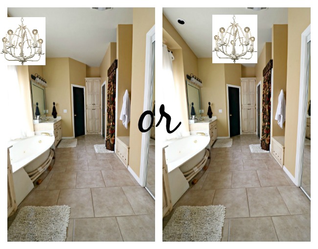 However, I can't decide where to put it. I wish my photo was pulled back a bit further, but I can't decide if I should center it in the room or hang it over the tub. Either way, we'll remove the two recessed eyeball lights currently over the tub window.