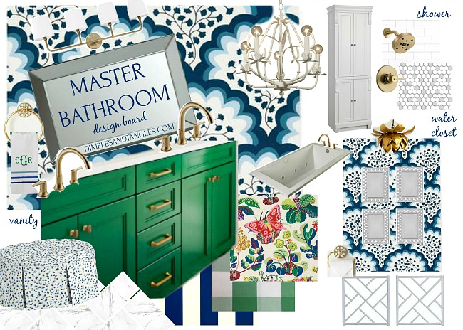 I think the green vanity was from an HGTV Magazine makeover and was the first piece to my puzzle. Pairing the playful blue and white wallpaper with it was a decision that quickly followed, and everything else kind of fell into place over time. I tried to represent all of the parts on this board as close as I could get them to what I'm actually using, but a few things might still change as I go along like fabric selections and accessories. It's not represented but walls that aren't getting wallpaper will be painted white.