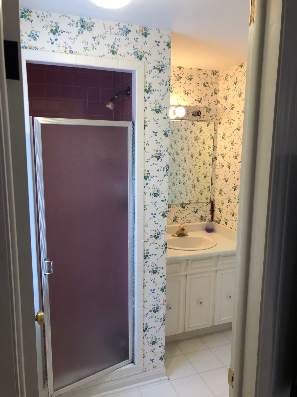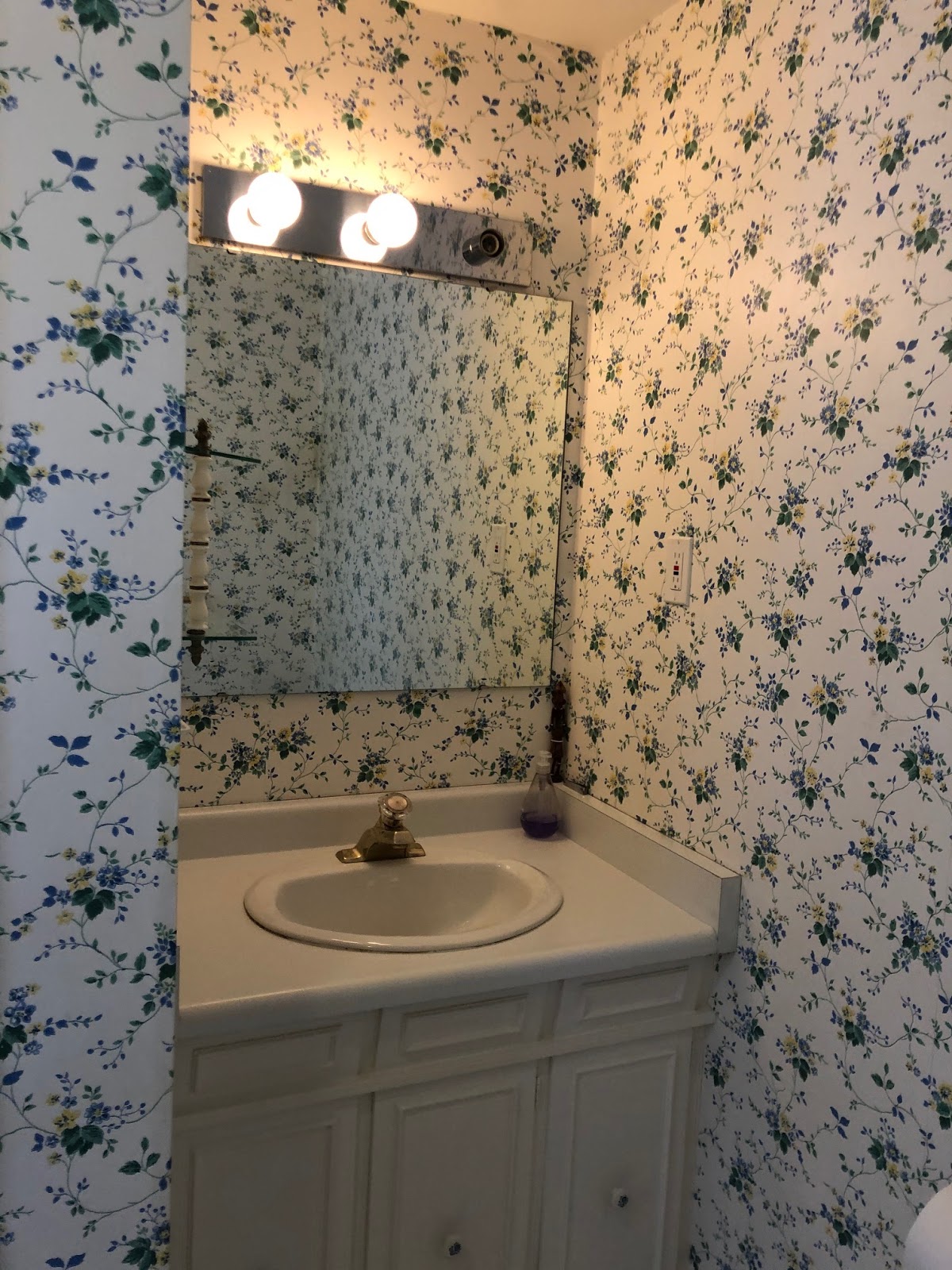 This little nugget of a room has some serious nostalgia. If my husband would let me I'd keep the wallpaper. The pink tube of a shower has to go though. The previous owners literally painted the pink tile white and it wasn't proving the test of time. Similar to the main bathroom we are going to refinish the cabinet, redo the shower with a glass door and pony wall and add a new mirror, light fixture, faucet and yes some sort of wall treatment.