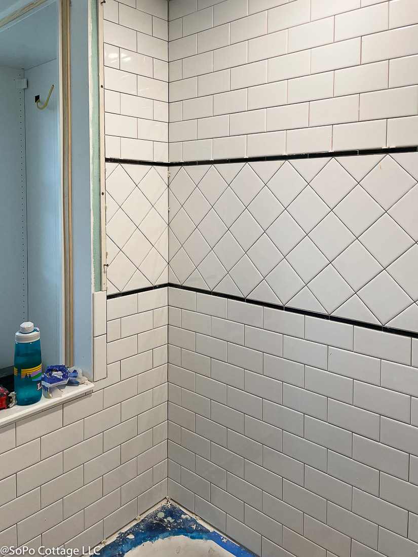 What do you think? Does it have that vintage vibe?For the walls, I wanted to stay with the black and white styling, so installed a simple white subway tile with a diagonal 4x4 set of tiles in the middle. It adds a bit of interest, without being overwhelming.